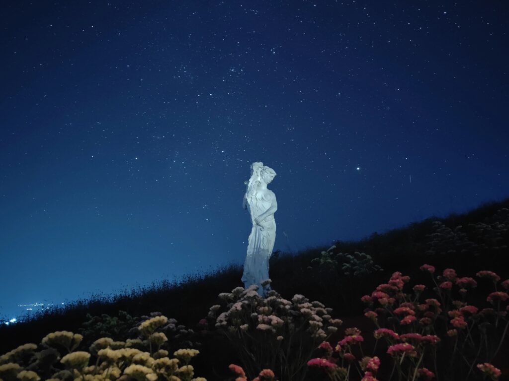 Beneath the swirling trails of stars, a solitary statue stands quietly in a field of blooming flowers—a symbol of peace and reflection. The circular motion of the night sky represents the passage of time and the unity of the universe, while the vibrant blossoms below speak of love, hope, and renewal.