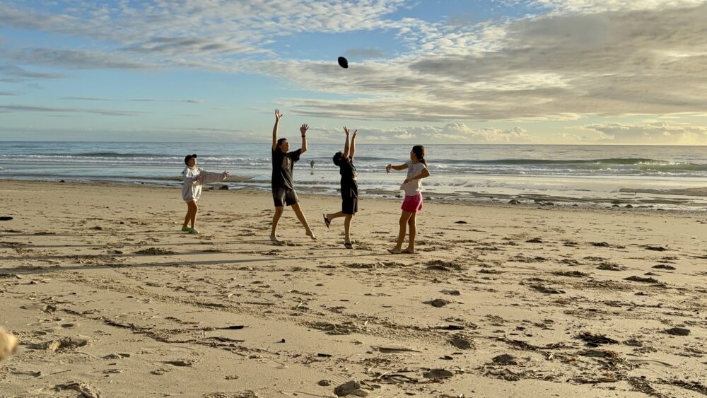 Two children are sharing a happy moment during Eid prayer on the street.