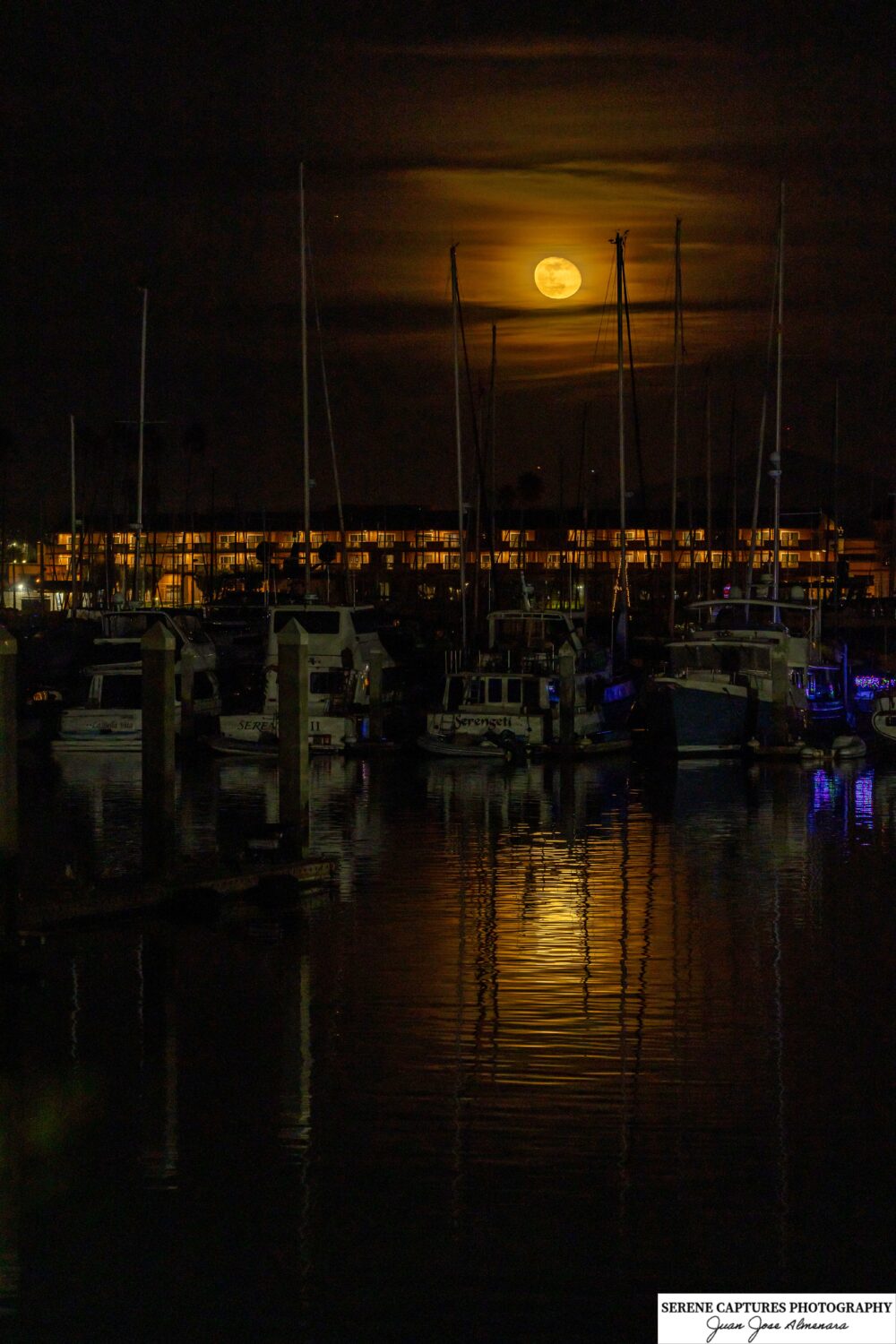 A full moon rises above the sleeping marina, casting molten gold across still waters. Sailboats rest in silhouette, their masts reaching quietly toward the night sky. In this suspended moment between light and shadow, the harbor breathes in silence.