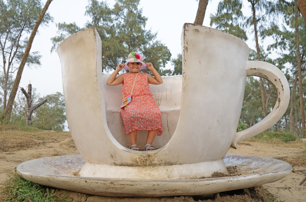 A child is sitting inside a cup-like bench in a children’s park.