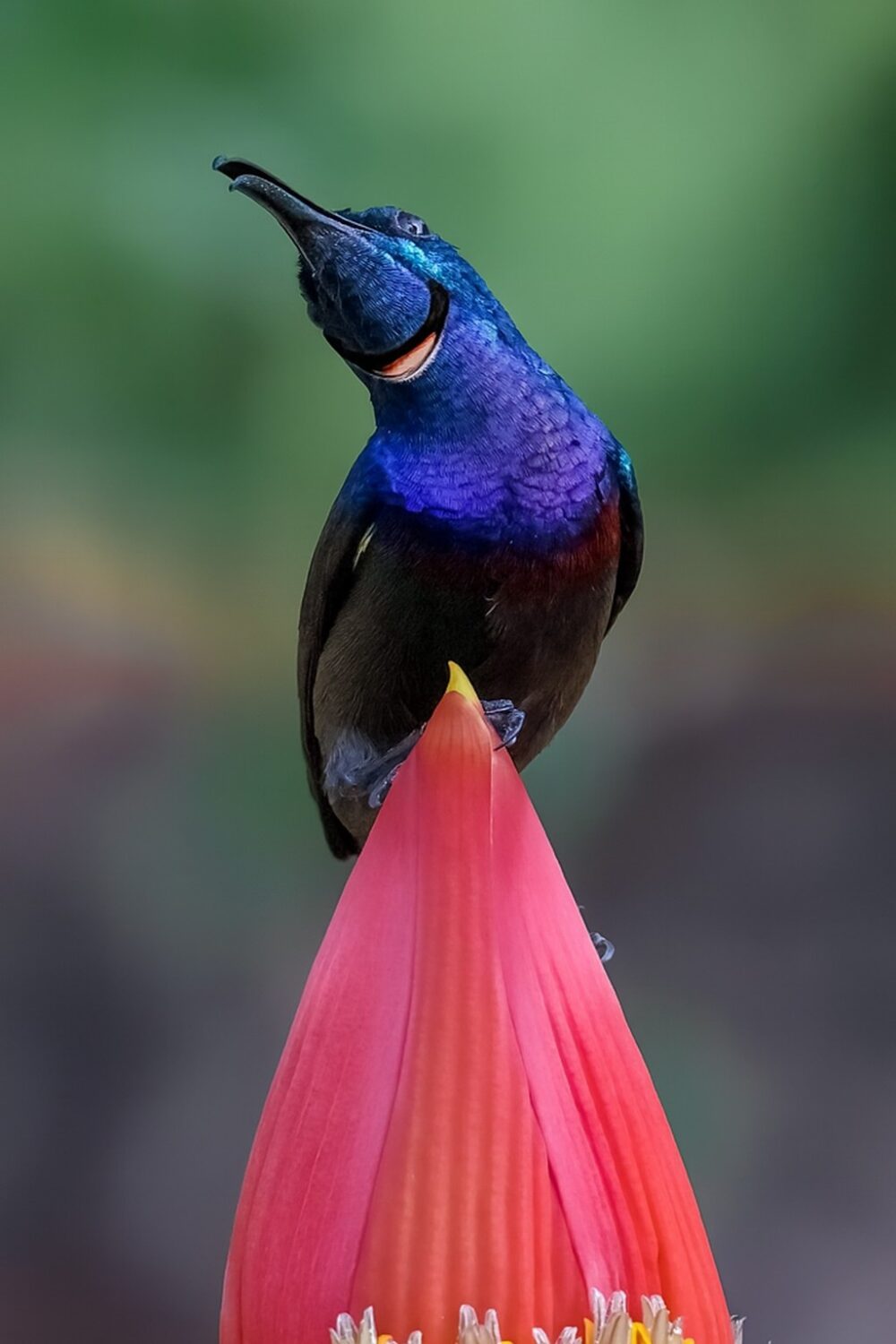 The Loten’s sunbird celebrating a cheerful stance atop an ornamantal banana bloom.