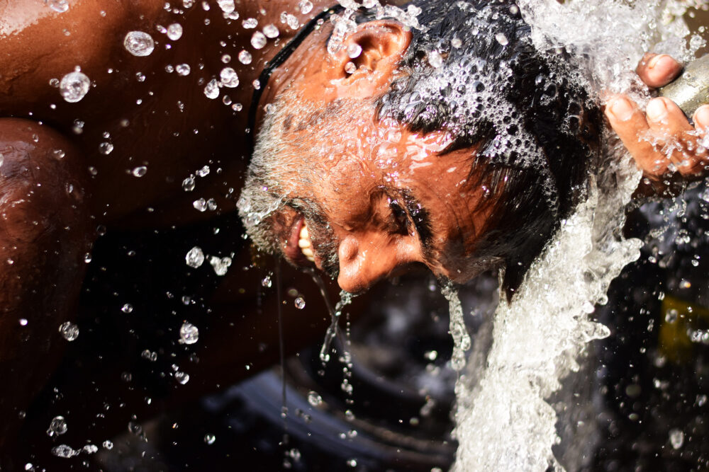 One of Shubhodeep’s featured works, The Price of Water, captures a migrant laborer in Kolkata during a fleeting moment of pause. After a day of physical labor under a brutal sun, the man cups his hands beneath a trickle of water. He smiles.