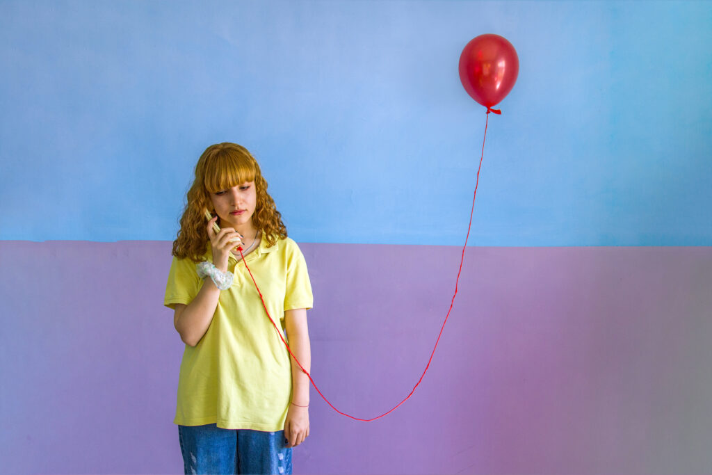This photograph captures a moment of communication where physical presence is absent, yet connection remains. The red string linking the girl to the balloon traces an emotional distance—visible, fragile, and unresolved.