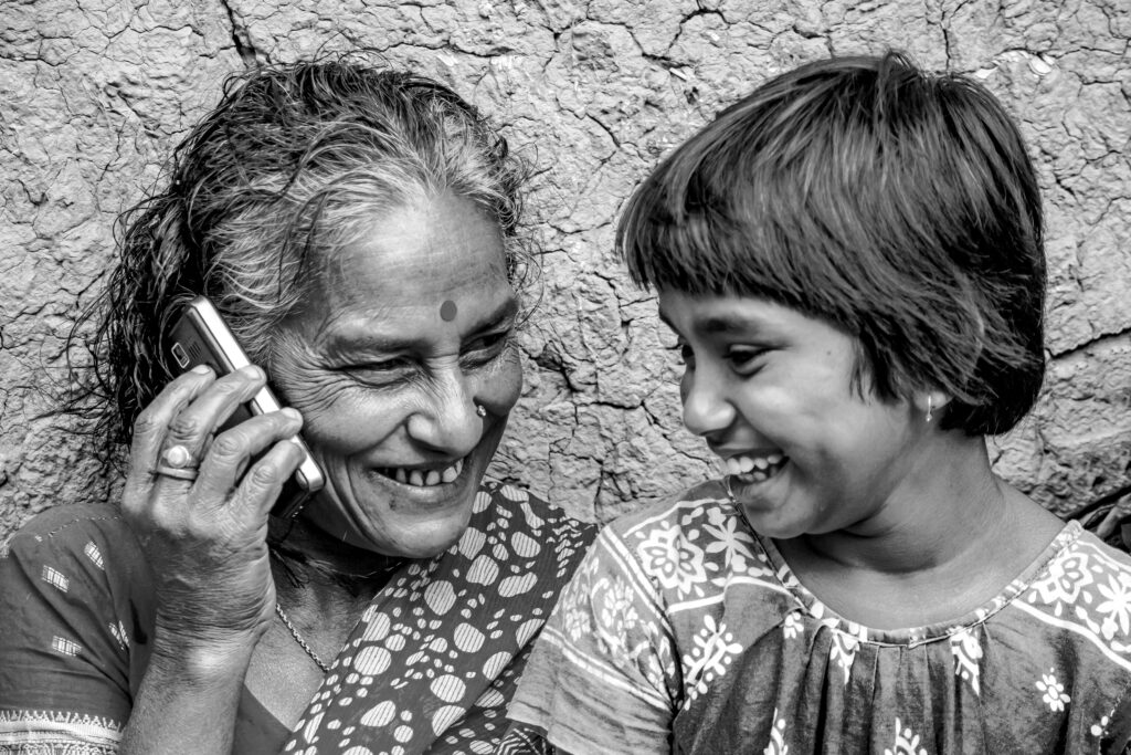 In this intimate black-and-white portrait, a grandmother shares a joyful moment with her granddaughter while speaking on a mobile phone. Their laughter flows effortlessly between them, dissolving age, time, and circumstance. The textured wall behind them contrasts with the warmth on their faces, emphasizing that happiness does not depend on surroundings but on connection. This […]