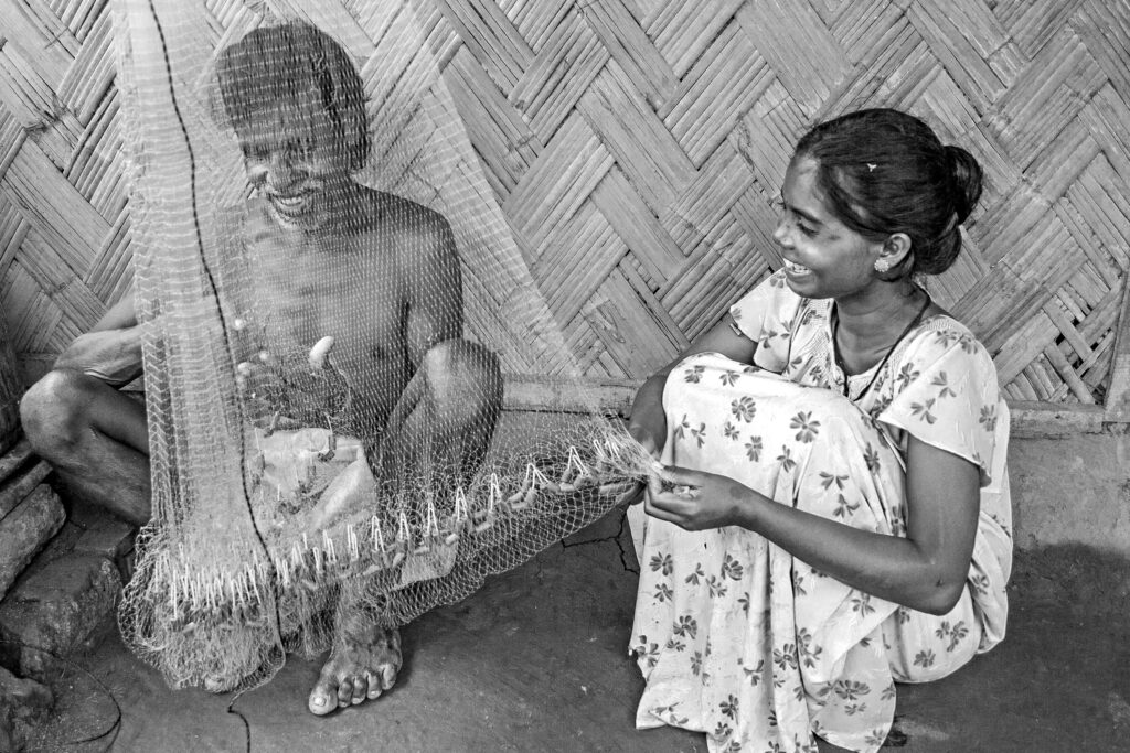 In this intimate black-and-white moment, a husband repairs his fishing net while his wife sits beside him, gently holding and helping. Their shared laughter transforms a routine task into a moment of pure joy. The net between them becomes a symbol of partnership — threads interlacing just as their lives are intertwined. Happiness here is […]