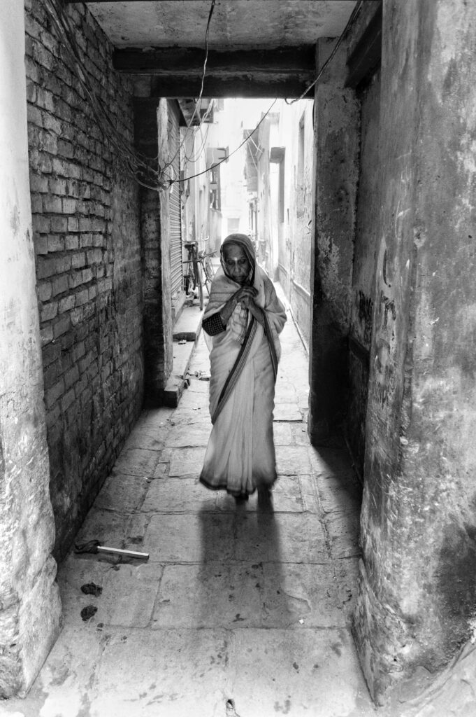 Through a narrow, shadowed alley, an elderly woman walks steadily forward. The walls feel heavy with time, the space confined, almost claustrophobic yet ahead, light waits. Hope is not dramatic here. It is quiet movement. It is choosing to walk forward despite age, weight, and darkness.