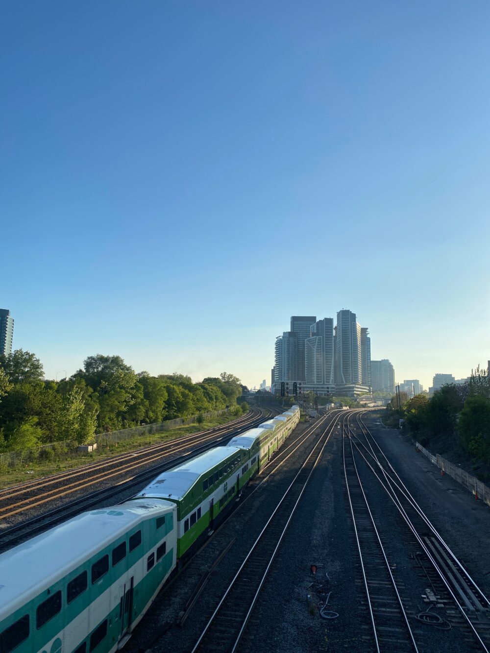 The trains carve silver lines toward Toronto’s rising skyline, where the morning light softens steel and glass. Here, movement meets stillness, and the city reveals its quiet poetry in motion.