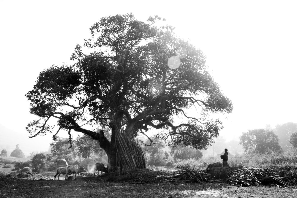 A majestic tree stands tall, its sprawling branches casting shelter over cattle grazing beneath. Nearby, a lone figure carries a bundle of wood, moving through the quiet rhythm of rural life. The play of light and shadow in black and white enhances the timelessness of the scene, symbolizing coexistence between humanity, nature, and tradition.